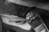 Charcoal face mask or black clay mud. Beautiful woman is applying purifying black mask on her face, close up studio shot. Home spa natural cosmetic concept.