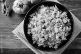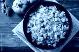Fried rice with vegetables in a black bowl, Asian food, top view