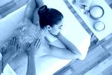 Young woman having body scrubbing procedure with sea salt in spa salon, top view