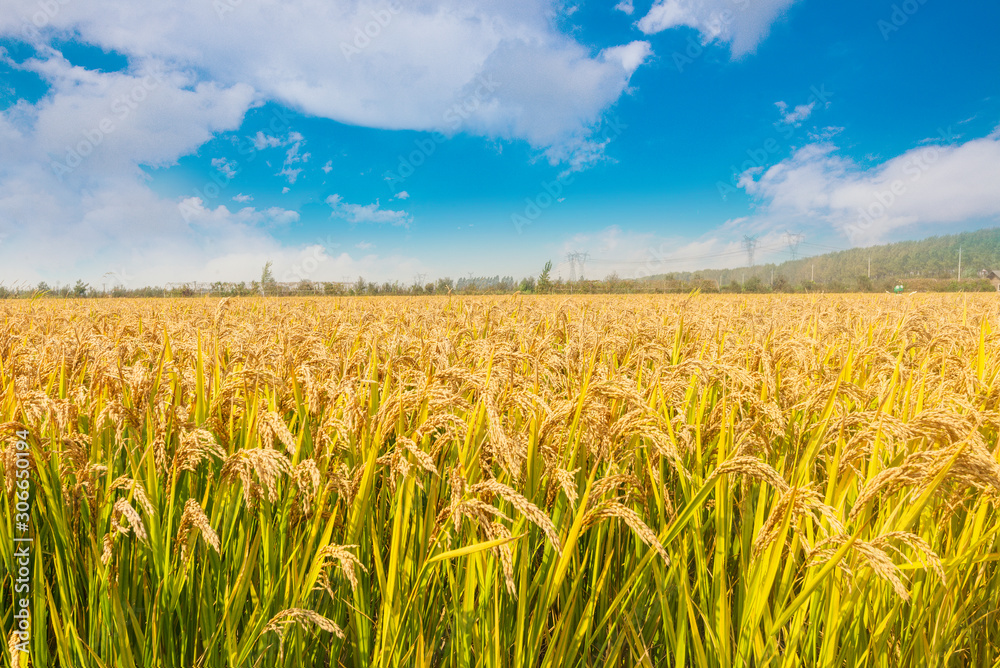 Under the blue sky and white clouds, the golden rice was heavy