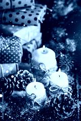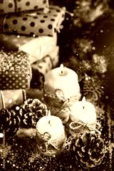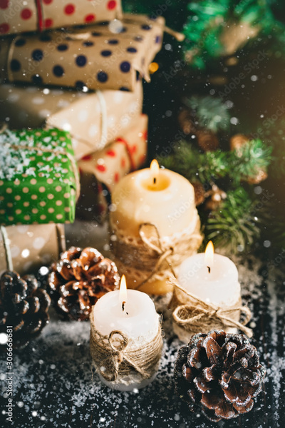 Merry Christmas and happy New year. Candle and Christmas toys on a wooden table. Bokeh. Selective focus.
