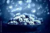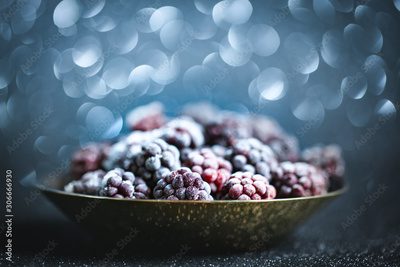 Frozen blackberries on a wooden table. Horizontal. Background with copy space.