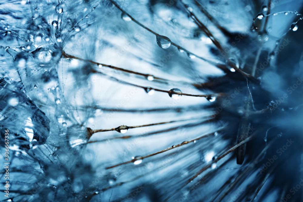 Beautiful dew drops on a dandelion seed. Macro. Beautiful soft light blue and violet background. Selective focus. Background with copy space.