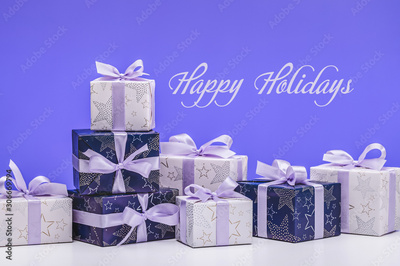 Gift boxes in smart paper with lilac ribbons, on a white background. Happy Holidays.