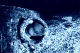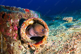 Giant Moray Eel hidden on a shipwreck in a tropical ocean