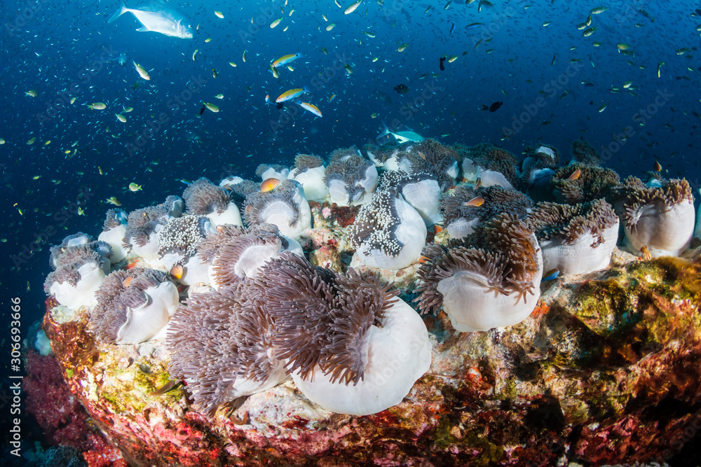 Huge carpet of Sea Anemones full of Skunk Clownfish on a tropical coral reef (Richelieu Rock)