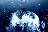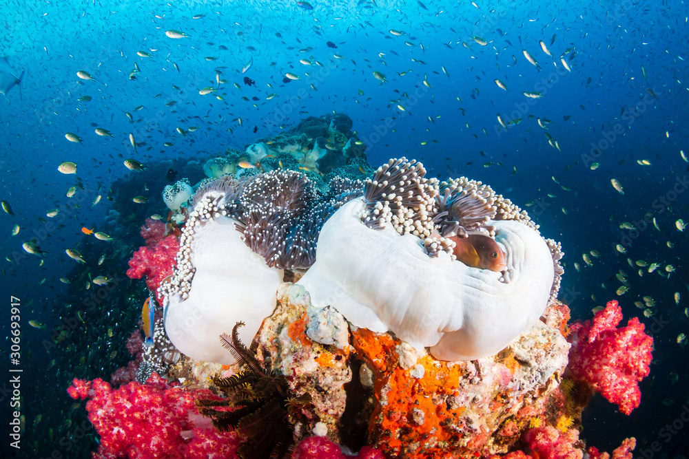 Huge carpet of Sea Anemones full of Skunk Clownfish on a tropical coral reef (Richelieu Rock)