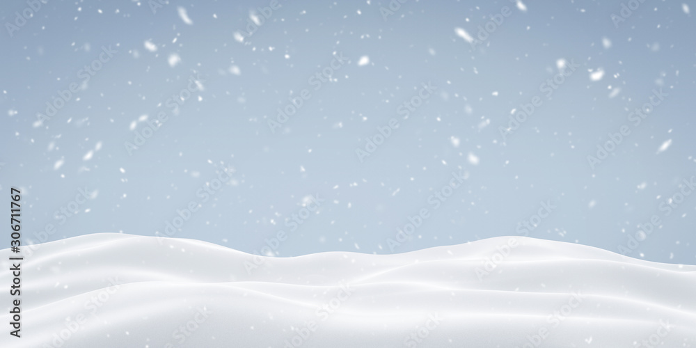 Falling Snowy landscape on blue background. Winter of snow mountain or snowdrift with slope backdrop decoration. 3D rendering.