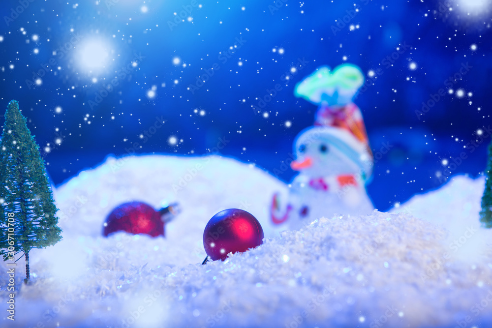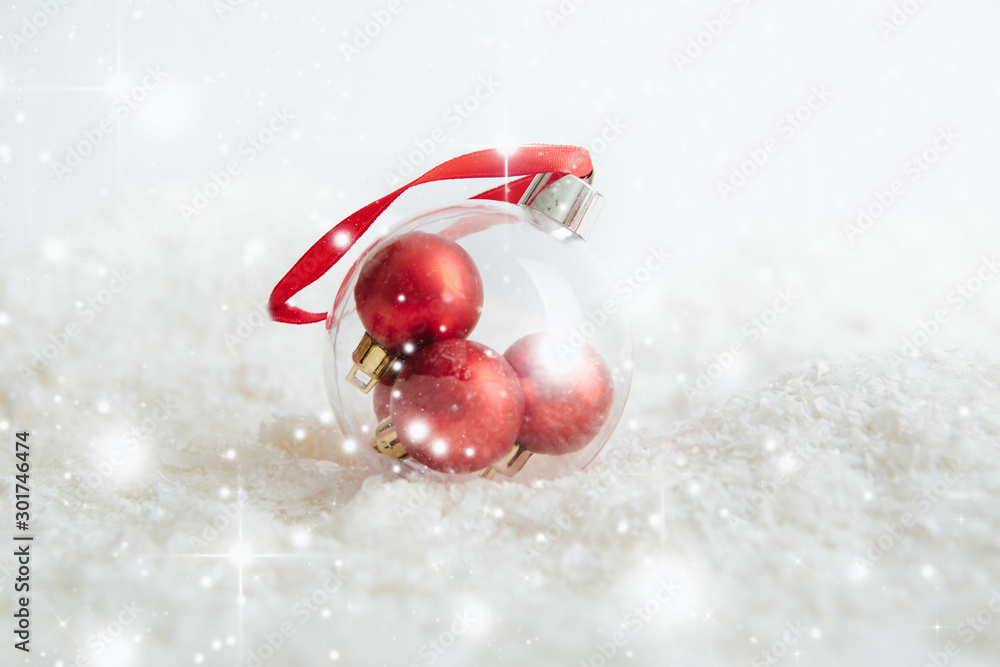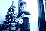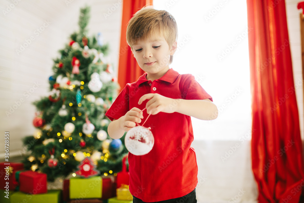 Cute little boy of about five year with blue eyes in a Santa Claus hat decorating a Christmas tree.