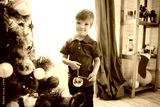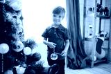 Cute little boy of about five year with blue eyes in a Santa Claus hat decorating a Christmas tree.