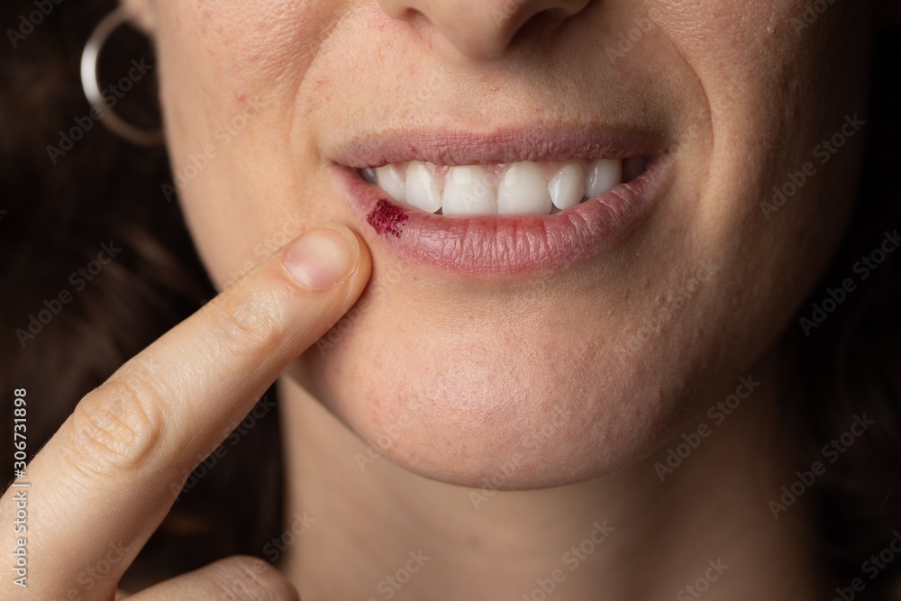 Girl points to a lipstick stain on her lower lip