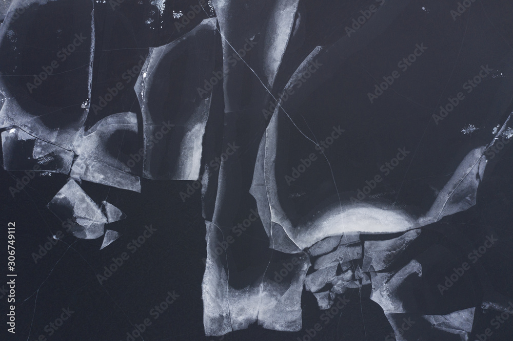 The first ice on the river. Abstract pattern consisting of ice floes and cracks. The view from the top.