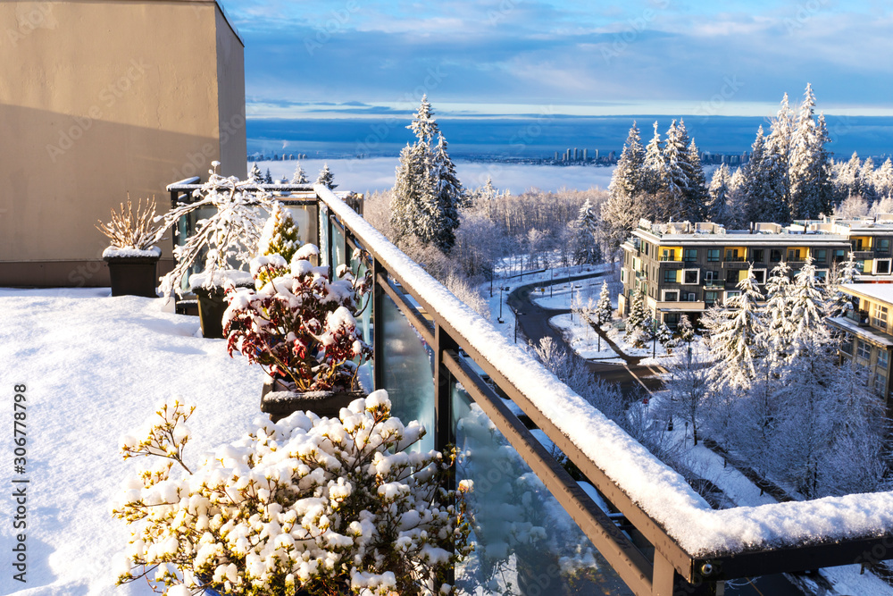 Snow-covered shrubs on a rooftop patio at UniverCity on Burnaby Mountain, BC