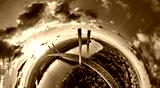 Beautiful panoramic aerial drone view to cable-stayed Siekierkowski Bridge over the Vistula river and Warsaw City skyscrapers, Poland in gold red autumn colors in November evening at sunset