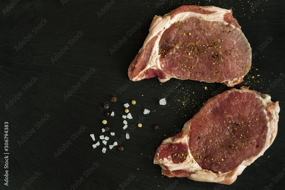 two raw pork steaks with spices on a black stone board close-up. top view with copy space
