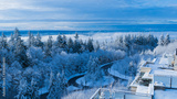 Pristine snow-laden conifers on burnaby Mountain against backdrop of cloud inversion