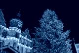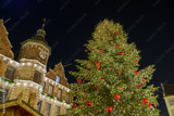 Night view of Christmas tree and Old Town Hall during Christmas Market Festival, weihnachtsmarkt, at Marktplatz in Düsseldorf, Germany.