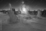 Lichterketten schmücken zur Weihnachtszeit die Schnee bedeckten Bäume auf dem Brocken im Harz