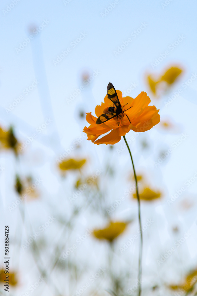 Yellow beautiful cosmos flower with honey bee