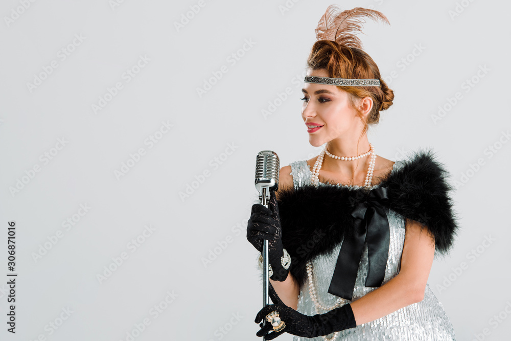 happy singer touching retro microphone isolated on white