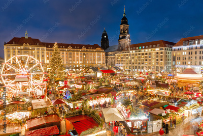 Christmas Market in Dresden, famous traditional European Winter holidays festive activity. Germany, Europe. Christmas vacations background, natural processing photo.