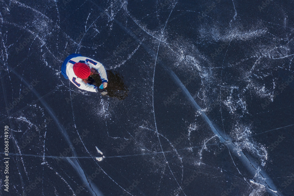 Transparent ice surface of the river with patterns from skates and deep cracks. A young woman sits on the ice and takes pictures on her smartphone.