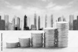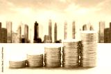 Stacked gold COINS and virtual city financial center background, financial concept creative map.