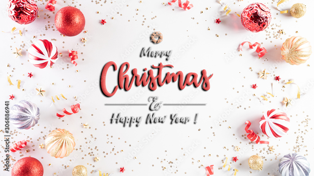 Christmas background concept. Top view of Christmas decoration, light golden and red pastel ball, star with snowflakes on white background.