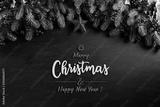 Christmas background concept. Top view of Christmas gift box red balls with spruce branches, pine cones, red berries and bell on black wooden background.