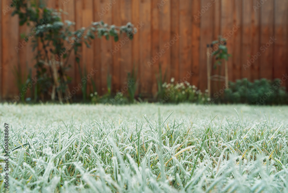 Frosty grass in the garden on winter, winter grass in the morning, frost on meadow in the garden