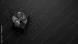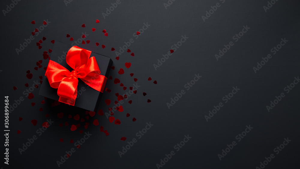 Merry Christmas and Happy Holidays. New Year. Valentine's day. Birthday. Black gift with red ribbon, present on black background top view.