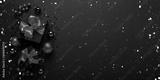 Merry Christmas and Happy Holidays greeting card, banner. New Year. Noel. Christmas red ornaments and gifts on black background top view. Winter xmas holiday theme.