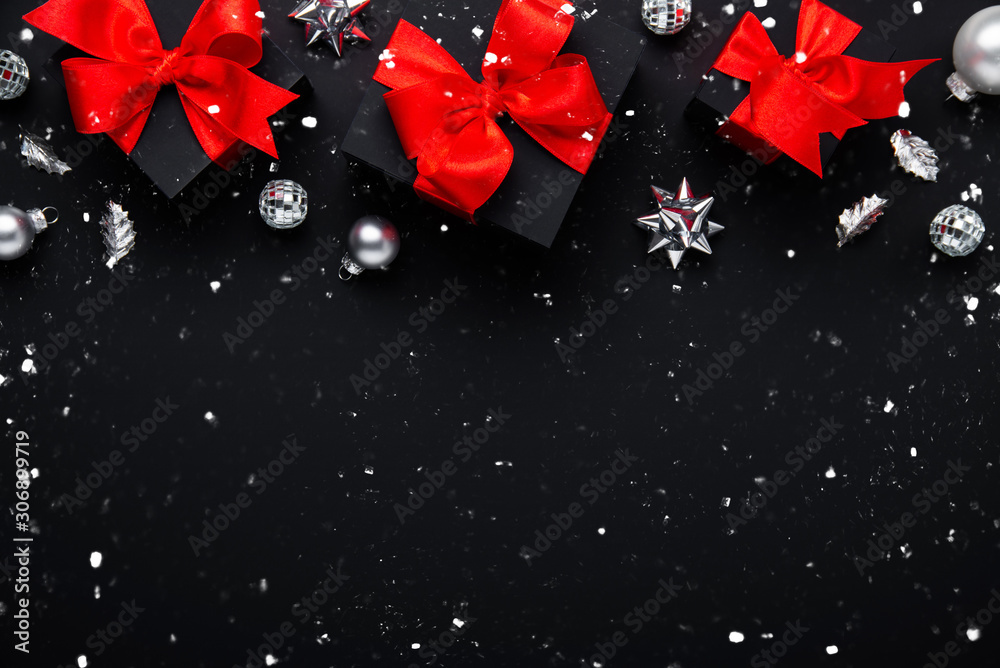 Merry Christmas and Happy Holidays greeting card, banner. New Year. Noel. Christmas red ornaments and gifts on black background top view. Winter xmas holiday theme.