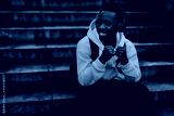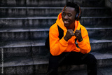 smiling african-american man in stylish orange hoodie sweatshirt in wireless headphones listening music and sitting on stairs. copy space