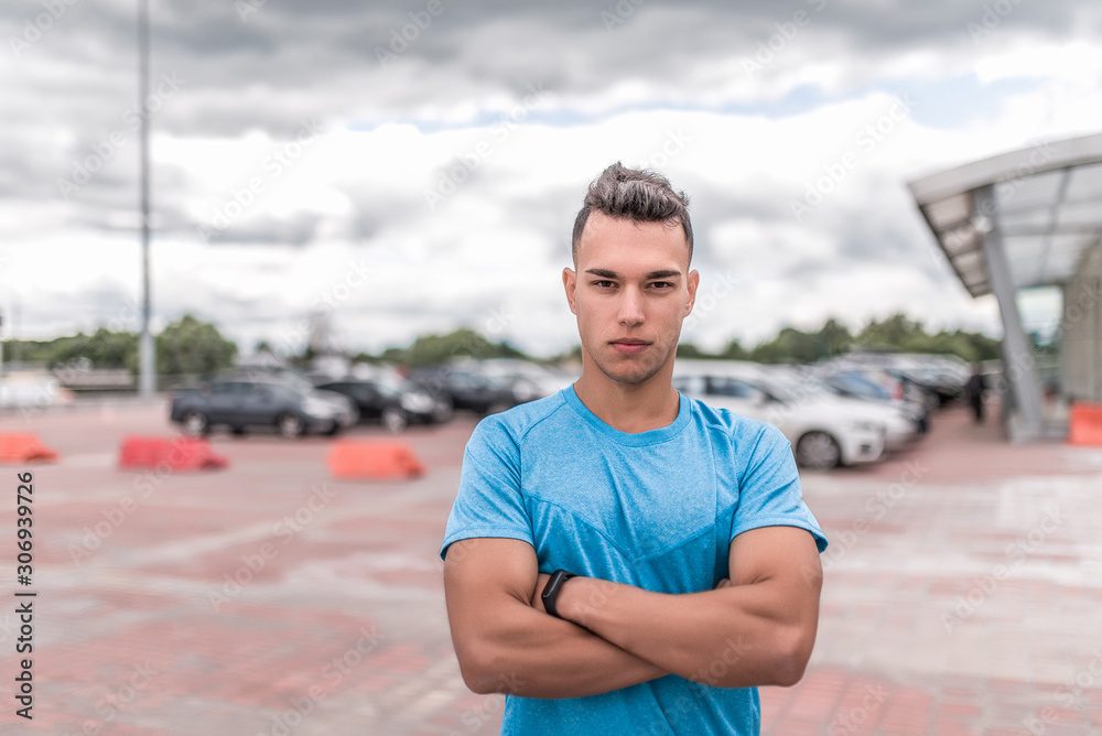 male athlete, resting after workout, looking confidently, strong and willed look, workout summer in the city. Fitness motivation youth lifestyle. Free space for copy text.