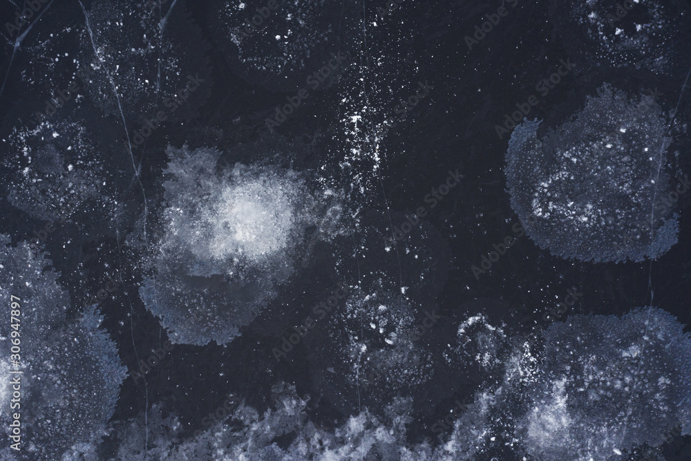 The frozen surface of the river is covered with ice patterns and thin cracks. The view from the top. Abstraction.