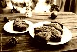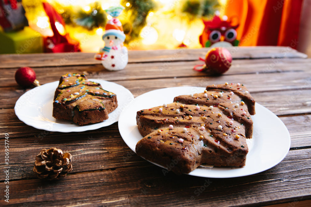 Homemade Christmas cake in the shape of a Christmas tree on a wooden table