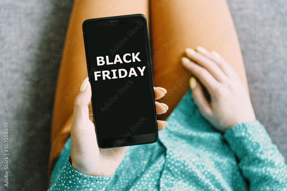 Woman holding phone with text Black Friday on screen, pov.