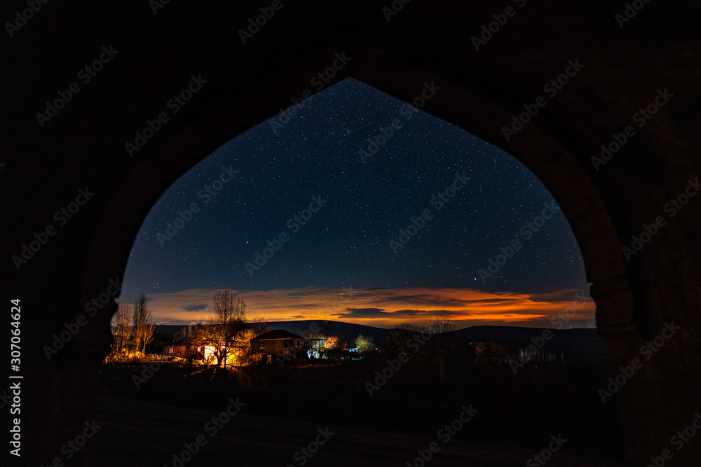 View of the night village from the window of the ancient mausoleum
