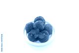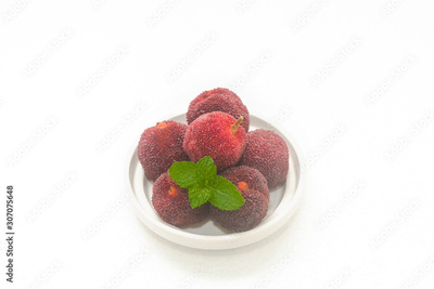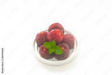 The ripe arbutus is served in a white container with one green leaf interspersed and isolated on a white background.