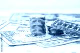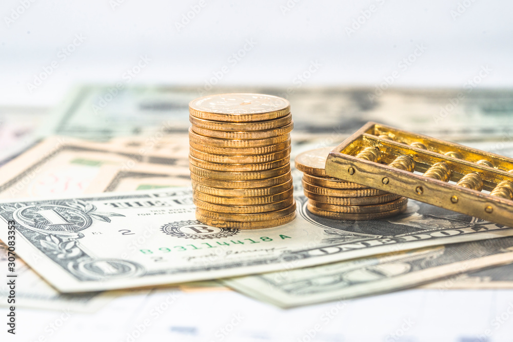 The gold COINS were stacked on top of the dollars