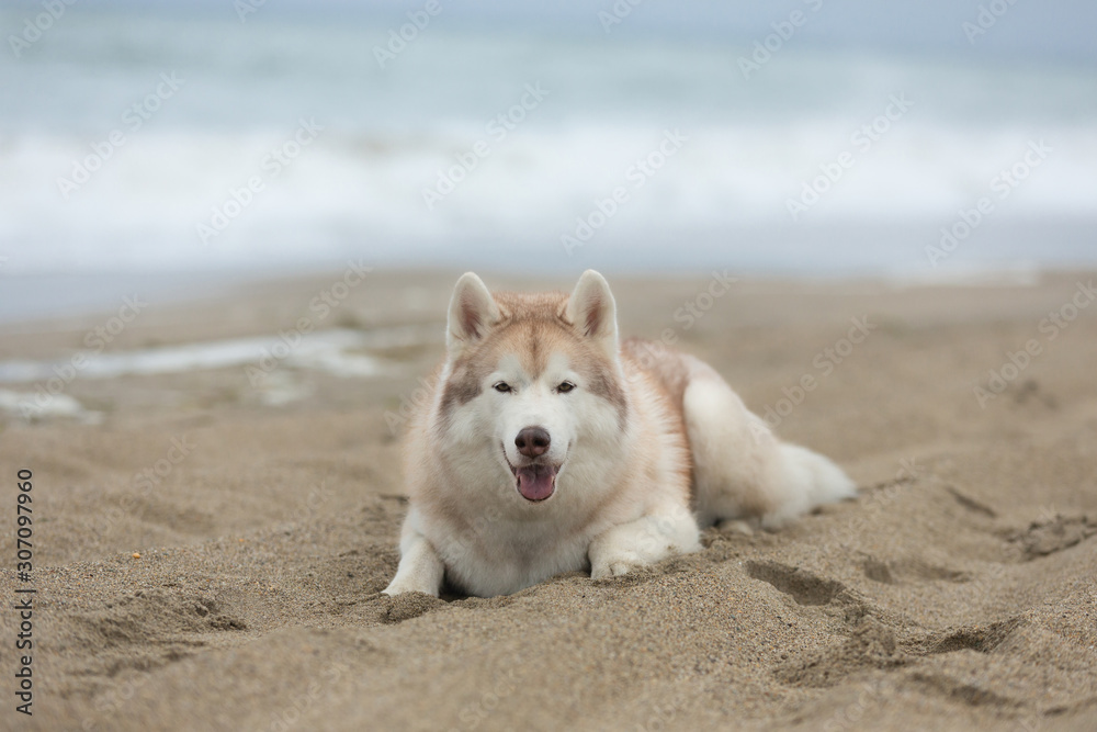 gorgeous Beige and white Siberian Husky dog lying on the beach.