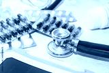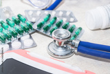 Stethoscopes on the table, empty capsules, medicines, bottles and medical supplies