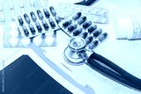 Stethoscopes on the table, empty capsules, medicines, bottles and medical supplies