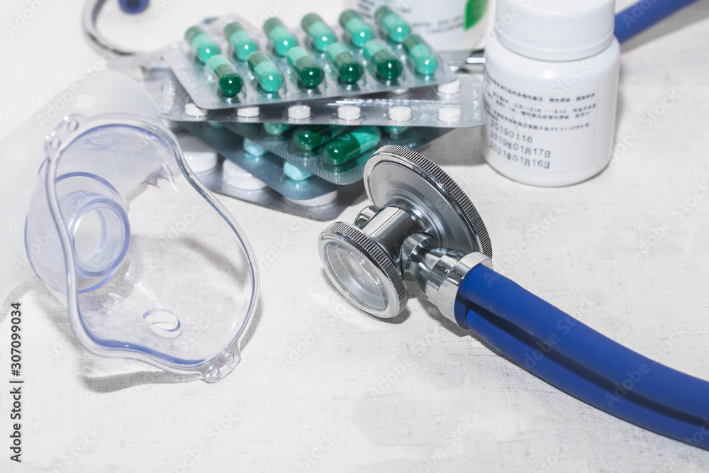 Stethoscopes on the table, empty capsules, medicines, bottles and medical supplies
