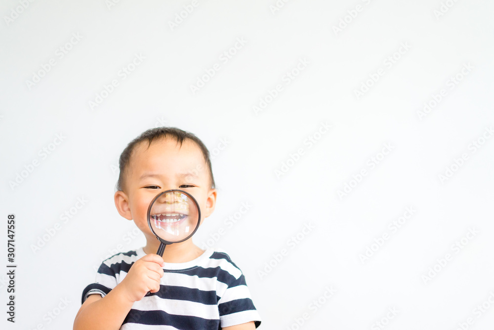 Little toddler boy child holding magnifying glass and showing front teeth with big smile on green grass: Healthy happy funny smiling face young adorable lovely boy kid with new tooth dental.