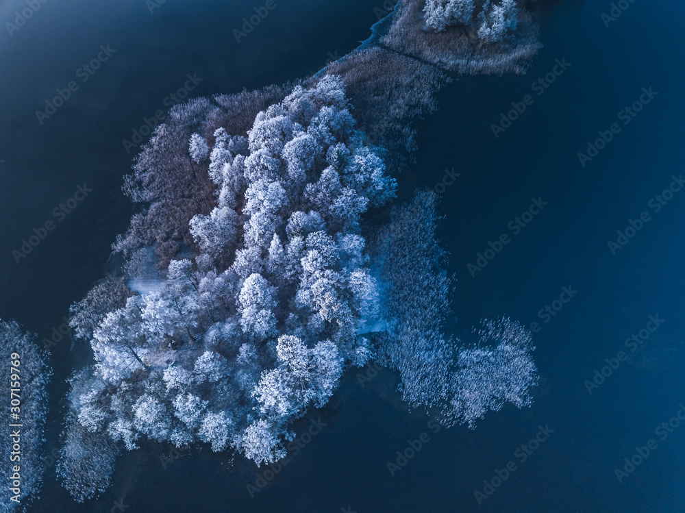 Frosty island in the blue lake, cold winter morning picture