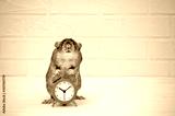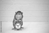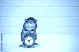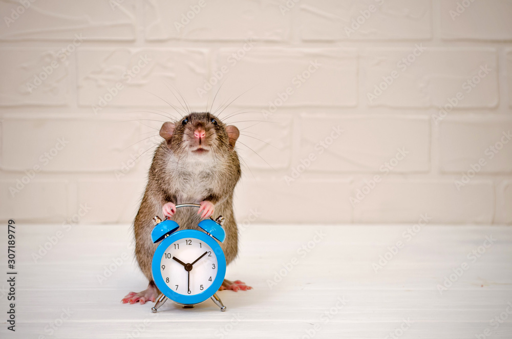 Gray rat or mouse sitting with a blue retro alarm clock on a white background with a brick wall. The concept of time, morning, deadline, new year with copyspace