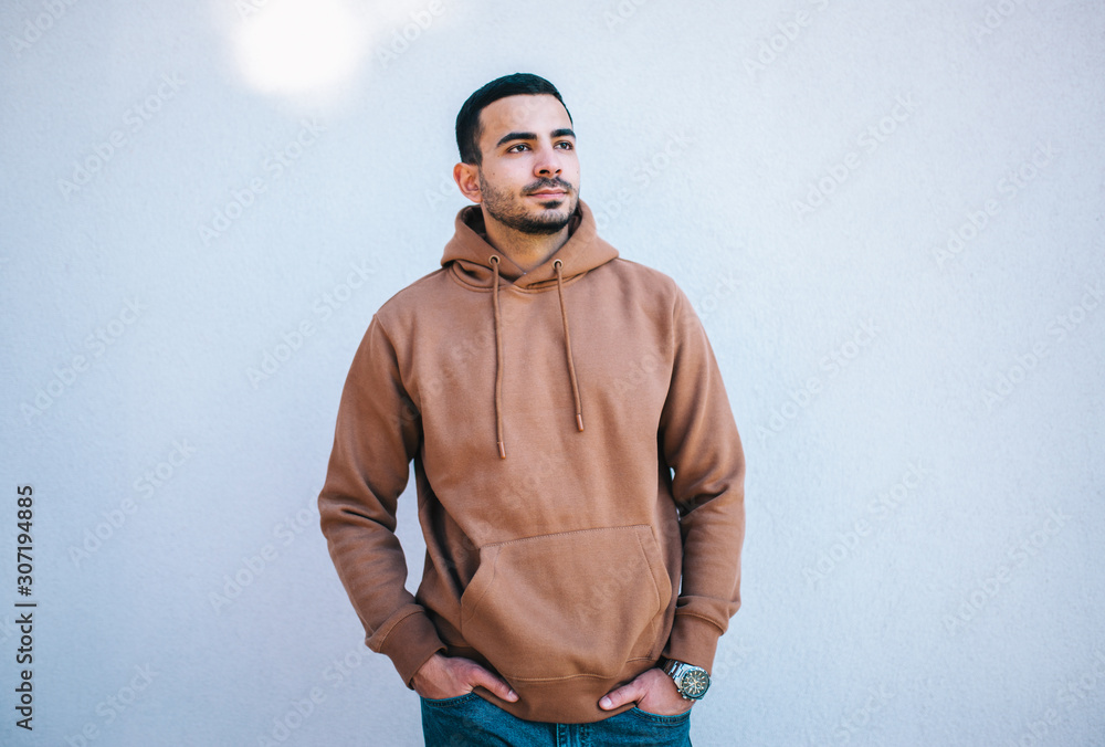 City portrait of handsome hipster guy with beard wearing brown blank hoodie or hoody with space for your logo or design. Mockup for print