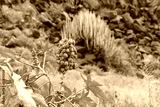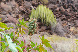 Selective focus on prickly fruits of wild castor oil plant (Ricinus communis) with Canary Island spurge in background (Tenerife, Spain)